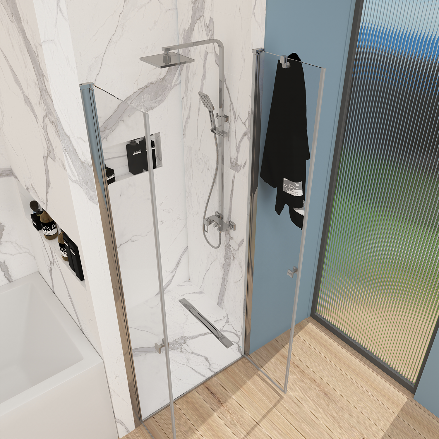 Shower Cabin with Two Hinged Doors Between Two Walls